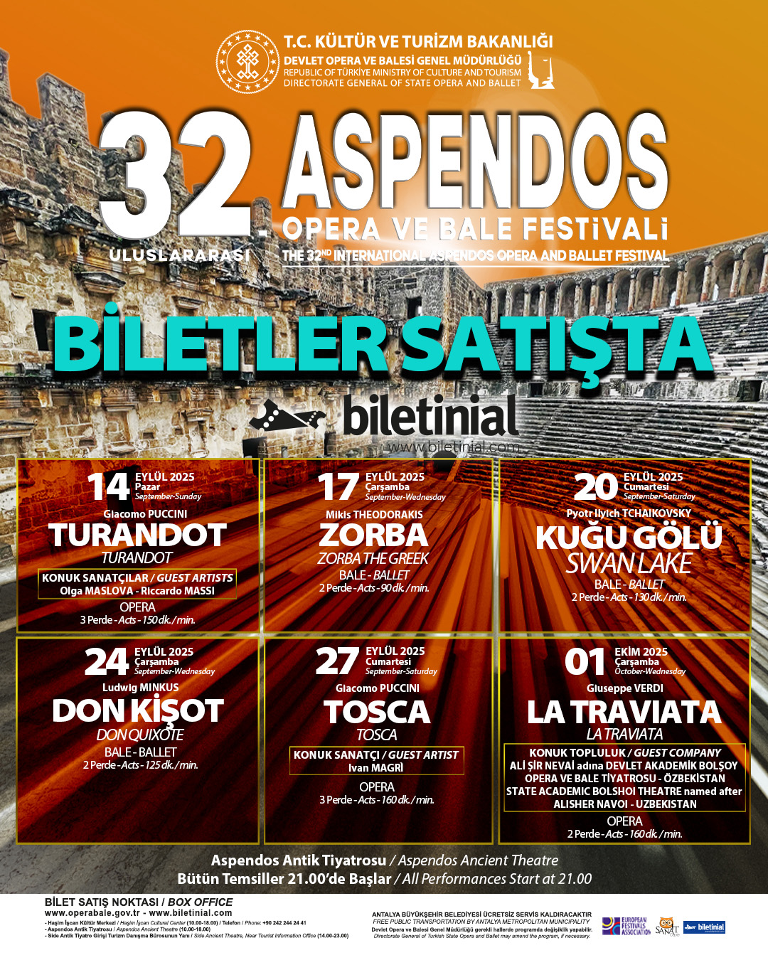 Festivalin açılışı 14 Eylül’de Puccini’nin ölümsüz eseri “Turandot” operası ile yapılacak. Ardından 17 Eylül’de Mikis Theodorakis’in müzikleriyle sahneye taşınan “Zorba” balesi, 20 Eylül’de ise Tchaikovsky’nin başyapıtı “Kuğu Gölü” (Swan Lake) izleyicilerle buluşacak.
