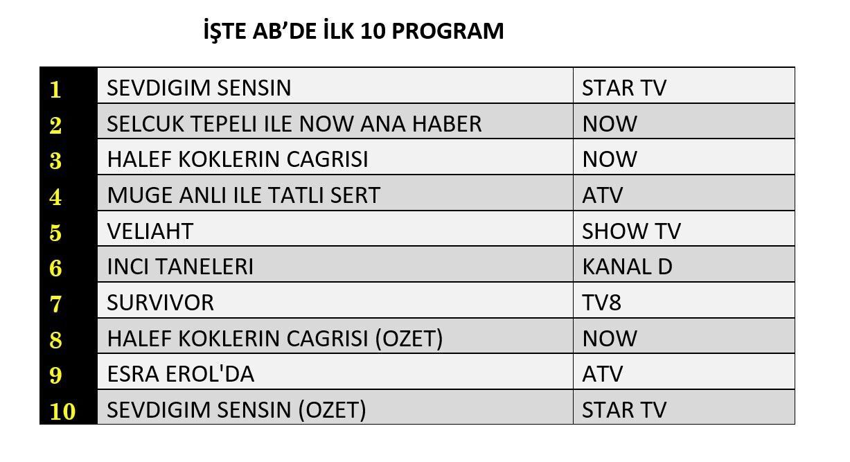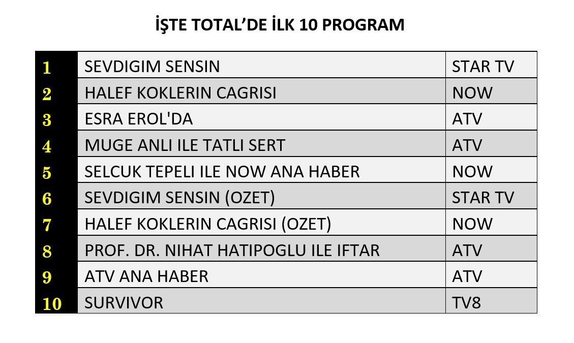 Prime time kuşağında yayınlanan “Sevdiğim Sensin”, 8.62 reyting ve yüzde 23.14 izlenme payı ile günün en çok izlenen programı oldu. Dizinin ardından NOW TV ekranlarında yayınlanan “Halef: Köklerin Çağrısı” 5.44 reyting ile ikinci sıraya yerleşti.