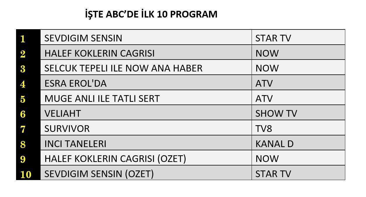 Prime time öncesinde yayınlanan dizilerin özet bölümleri de ilk 10 listesinde yer aldı. “Sevdiğim Sensin (Özet)” ve “Halef: Köklerin Çağrısı (Özet)” izleyiciden önemli bir izlenme oranı aldı.
