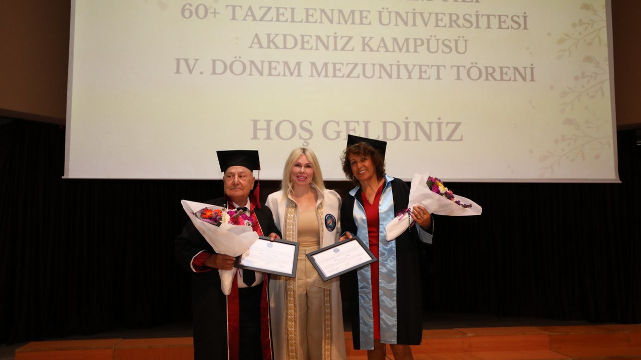 Akdeniz Üniversitesi'nin 60+ Tazelenme Üniversitesi dördüncü dönem mezunlarını uğurladı. Törende 107 lisans öğrencisi mezun olurken, bu yıl ilk kez 101 yüksek lisans öğrencisi de diplomalarını aldı. Rektör Prof. Dr. Özlenen Özkan, öğrencilerin talebi üzerine doktora programı başlatılması için söz verdi.