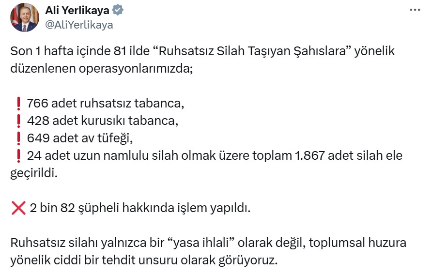 İçişleri Bakanı Ali Yerlikaya, son 1 haftada 81 ilde düzenlenen operasyonlarda 1.867 silah ele geçirildiğini ve 2.082 kişinin hakkında işlem yapıldığını açıkladı.