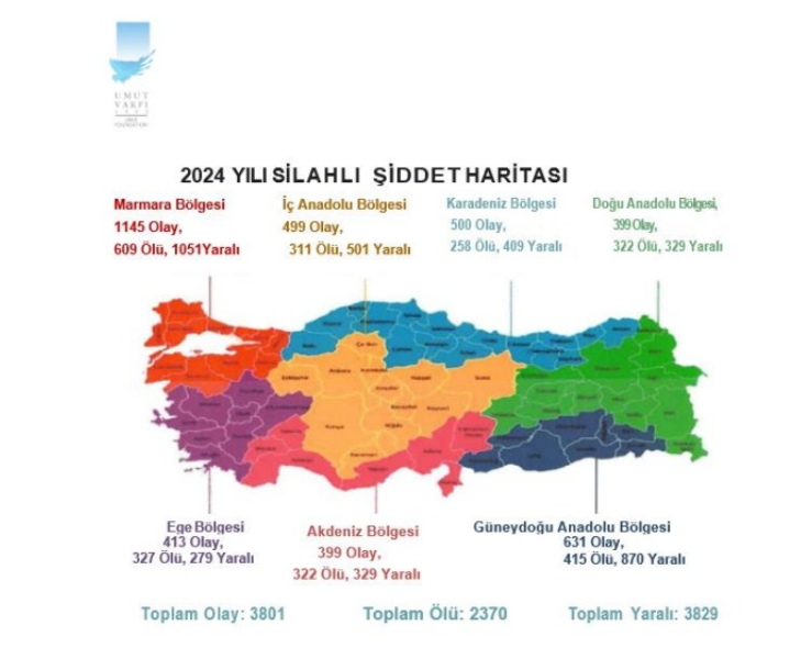 Bireysel silahlanma ile mücadele amacıyla oğlu da silahlı bir saldırıda hayatını kaybeden Nazire Dedeman tarafından kurulan Umut Vakfı'nın 2024 Yılı Şiddet Haritası verilerine göre, Türkiye genelinde, 3 bin 801 olay basına yansıdı. Bu 3 bin 801 olayda, 2 bin 370 kişi öldürüldü, 3 bin 829 kişi de yaralandı.