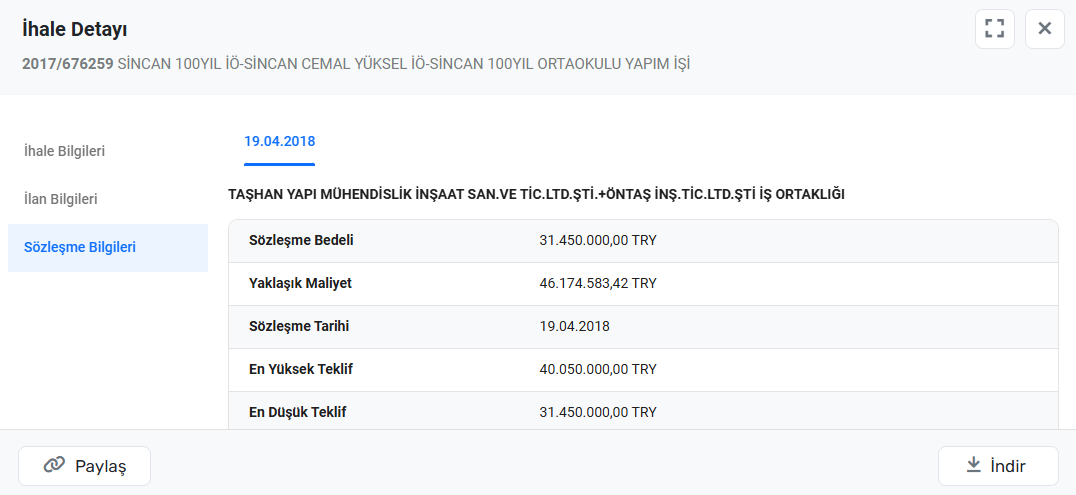 Yine aynı dönemde Ankara Valiliği YİKOB’un ihale ettiği Sincan’daki ortaokul yapım işleri, 19 Nisan 2018 tarihli sözleşmeye göre 31 milyon 450 bin TL bedelle Taşhan Yapı-Öntaş İnşaat ortaklığına verilmiş. İhalede adı geçen Taşhan Yapı Mühendislik İnş., Öntaş İnşaat ile aynı adresi kullanıyor. Taşhan Yapı’nın sahipleri ise Nallıhan eski Belediye Başkanı İsmail Öntaş’ın kardeşi Ahmet Öntaş ve yeğeni Remzi Öntaş. Taşhan Yapı da Ankara başta olmak üzere civar illerde kamu ihaleleri almış.