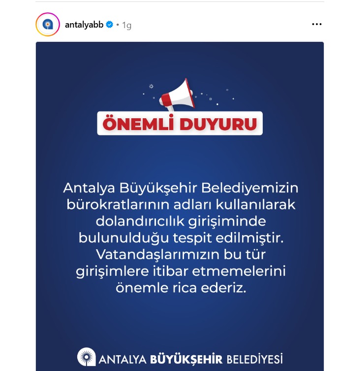 Belediyeden yapılan duyuruda, vatandaşların bu tür girişimlere karşı dikkatli olmaları ve hiçbir şekilde itibar etmemeleri gerektiği vurgulandı. Açıklamada, “Antalya Büyükşehir Belediyemizin bürokratlarının adları kullanılarak dolandırıcılık girişiminde bulunulduğu tespit edilmiştir. Vatandaşlarımızın bu tür girişimlere itibar etmemelerini önemle rica ederiz” ifadelerine yer verildi.
