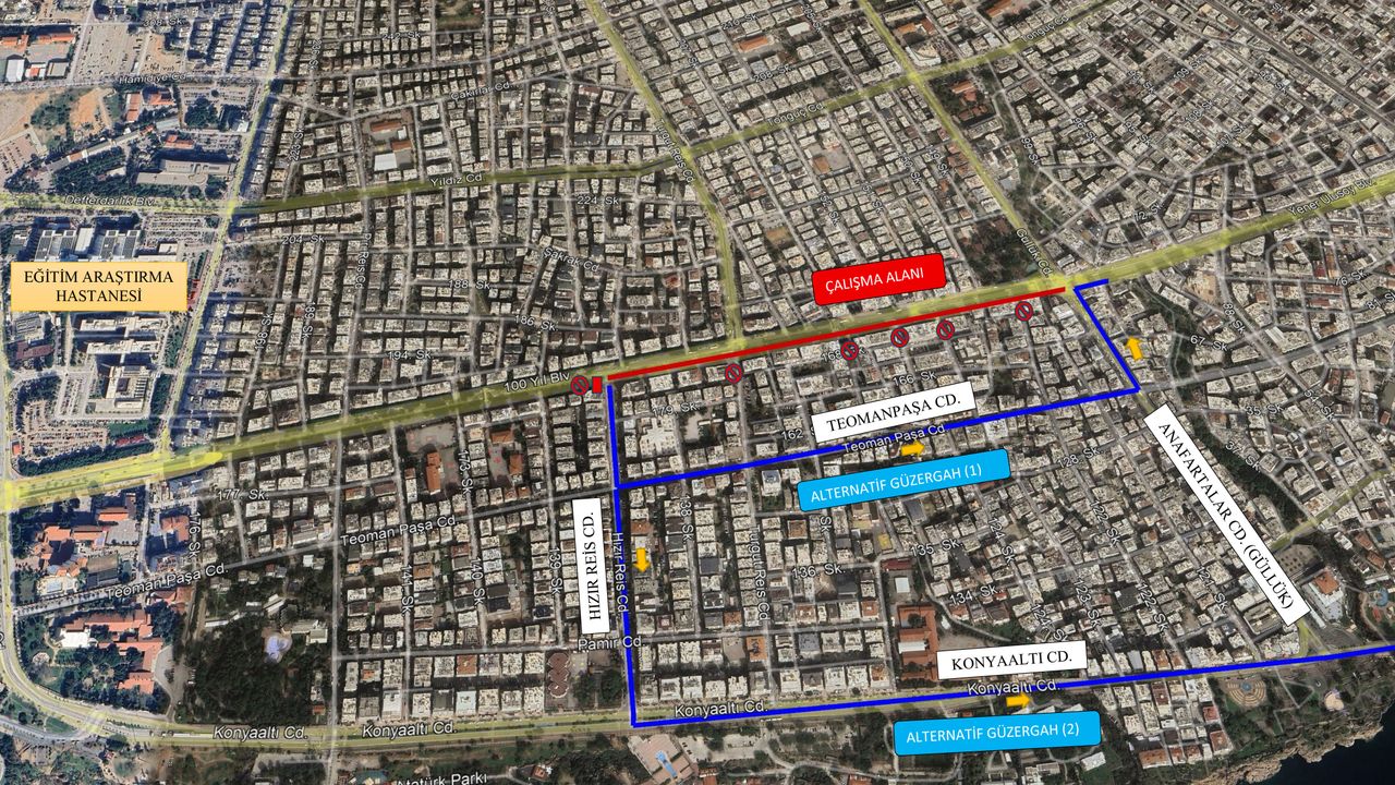 Büyükşehir Belediyesi Fen İşleri Dairesi Başkanlığı tarafından yürütülen çalışma kapsamında 100. Yıl Bulvarı’nın Konyaaltı istikametinden şehir merkezi yönüne gidiş bölümünde asfalt yenileme çalışması yapılacak. Hızır Reis Caddesi ile Anafartalar Caddesi (Güllük Kavşağı) arasında kalan yaklaşık 730 metrelik bölüm 8 Mart 2026 Pazar günü saat 07.00 itibarıyla araç trafiğine kapatılacak.