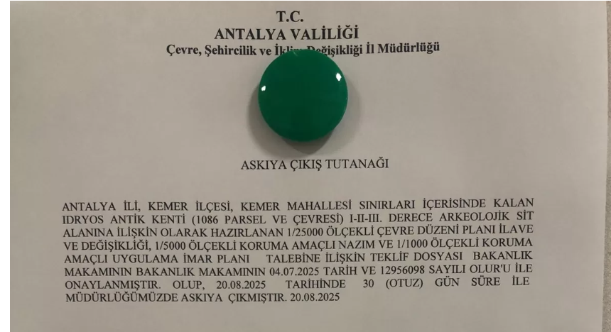 “Bugün sizlere, Kemer Idyros Antik Kenti’ne karşı planlanmış olan bir talan girişimini duyurmak istiyoruz. Bu girişimi bizler, 20 Ağustos 2025 tarihinde Çevre Şehrcilik ve İklim Değişikliği Antalya İl Müdürlüğü’nde askıya çıkmış olan bir ‘Koruma Amaçlı İmar Planı’ aracılığıyla öğrenmiş bulunuyoruz. Görünen odur ki, görevi tarihi ve doğal değerlerimizi korumak olan bazı kurumlarımız görevlerini bilerek ya da bilmeyerek yerine getirmemektedirler. Bu durum bizleri bir kez daha Antalya’mızın tarihi ve doğal değerlerini korumak için harekete geçmek zorunda bırakmıştır. Bu talan girişimine karşı ‘Idyros Antik Kentine Dokunma Hareketi’ olarak bir araya geldik. Üzgünüz ancak yılgın değiliz. Bu güzel vatanı cahillik ve ticari açgözlülüğün pençelerine terk etmemeye kararlıyız. “