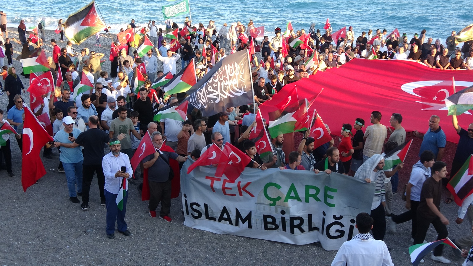 Antalya Kudüs Platformu’nun çağrısıyla bir araya gelen yüzlerce kişi, Konyaaltı Olbia Meydanı’nda toplandı. Katılımcılar, Gazze’de hayatını kaybeden çocukları temsilen kefene sarılmış bebek figürleri taşıdı. “Antalya’dan Gazze’ye direnişe bin selam” ve “Çocuklar ölürken sessiz kalınmaz” sloganları atan grup, yaklaşık 2 kilometrelik yürüyüşle Konyaaltı Kent Meydanı’na ulaştı. Yürüyüşe karadan motosiklet grupları, denizden ise tekneler destek verdi. Konyaaltı sahili boyunca ilerleyen korteje vatandaşlar da alkışlarla eşlik etti.