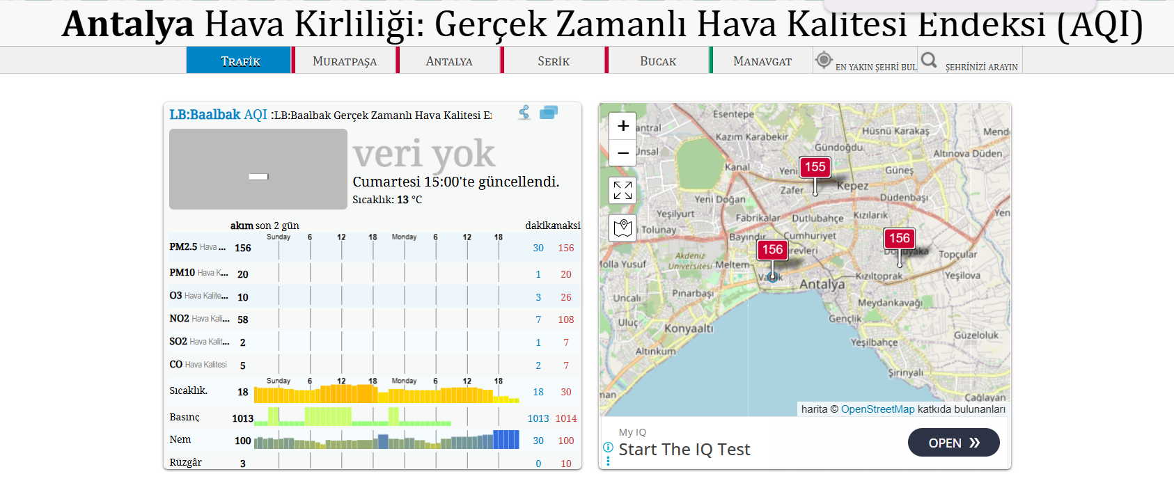 WAQI verilerine göre Antalya’da PM 2.5 değeri 151 olarak ölçüldü. Bu değer, Amerika Birleşik Devletleri (ABD) Çevre Koruma Ajansı’nın (EPA) hava kalitesi sınıflandırmasına göre “sağlıksız” kategorisinde yer alıyor. Aynı verilere göre Türkiye genelinde hava kalitesinin en kötü olduğu il Bolu olurken, Antalya yüksek kirlilik seviyesiyle dikkat çekti.