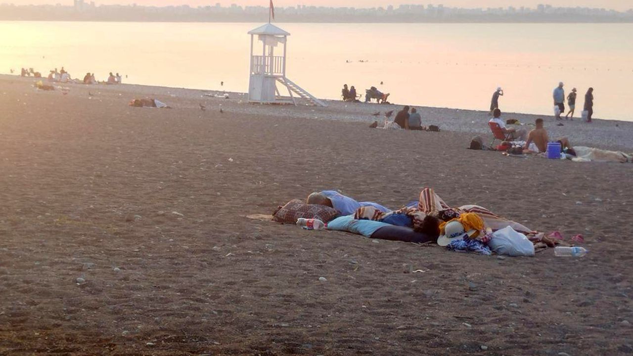 Antalya’da gecenin karanlığı bile serinlik getirmeyince, vatandaşlar battaniyelerini, hasırlarını alıp Konyaaltı Sahili’ne akın etti. Kimi çakıl taşları üzerine serdiği örtüde uyumaya çalıştı, kimi sabaha karşı denize girerek serinlemeye çalıştı. Sahil, adeta açık hava yatakhanesine döndü.