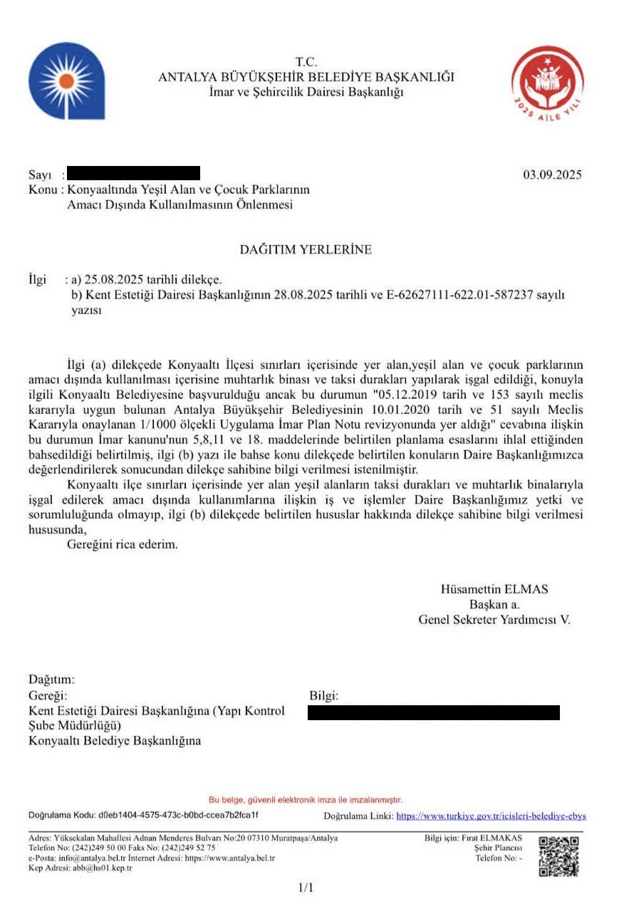 Bunun üzerine Antalya Büyükşehir Belediyesi’ne yazılı başvuruda bulunan vatandaşlar, Konyaaltı ilçesi sınırlarında bulunan yeşil alan ve çocuk parklarının amacı dışında kullanıldığını, Muhtarlık binası ve taksi durakları ile işgal edildiğini belirterek çözüm istendi. Antalya Büyükşehir Belediyesi’nin başvuruya verdiği yanıtta ise Konyaaltı ilçesindeki park ve yeşil alanların işgal edilerek amacı dışında kullanımlarına ilişkin iş ve işlemlerin ilgili Kent Estetiği Daire Başkanlığının yetki ve sorumluluğunda olmadığı belirtildi. Genel Sekreter Yardımcısı Vekili Hüsamettin Elmas imzasıyla verilen yanıtta, konunun dilekçe sahibine de iletilmesi istendi.