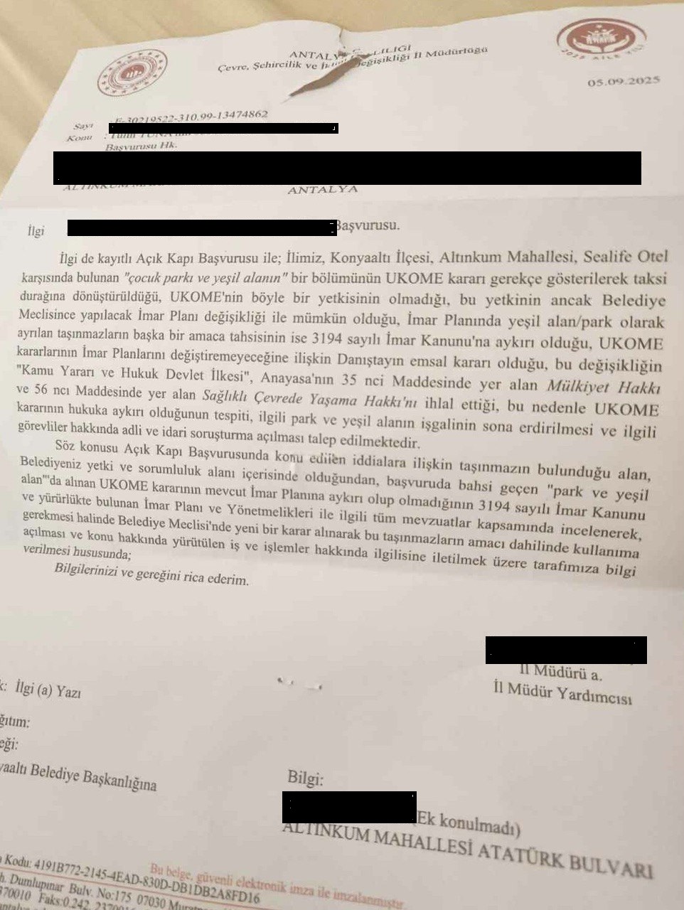 Bu yanıt üzerine yine çözümsüzlükle baş başa kalan vatandaşlar, bu kez de Çevre, Şehircilik ve İklim Değişikliği İl Müdürlüğü’ne başvurdu. Açık Kapı uygulaması üzerinden yapılan başvuruda, Altınkum Mahallesi’ndeki parkların UKOME kararı gerekçe gösterilerek amaç dışı kullanıldığı ve taksi durağı yapıldığı belirtildi. Yapılan uygulamanın 3194 Sayılı İmar Kanununa aykırı olduğu belirtilen başvuruda, UKOME kararları ile imar planlarının değiştirilemeyeceği yönündeki Danıştay kararının bulunduğu hatırlatıldı. Başvuruda ayrıca parkların amacı dışında kullanılmasının Anayasa’nın 35. ve 56. Maddelerine aykırılık teşkil ettiği de vurgulanarak işgallerin sona erdirilmesi, sorumlular hakkında ise adli ve idari soruşturma açılması talep edildi.