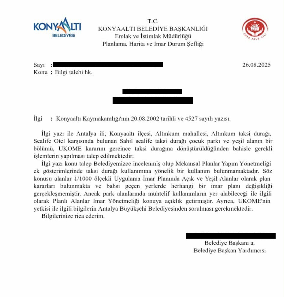 Konuyla ilgili öncelikle Konyaaltı Belediyesi’ne bir dilekçe ile başvuran vatandaşlar, sorunun çözülmesini talep etti. Konyaaltı Belediyesi’nin dilekçeye verdiği yanıtta, park içerisinde yer alan Altınkum Taksi ile Sahil Taksi duraklarının herhangi bir imar planı değişikliğine dayanmadığı, Planlı Alanlar İmar Yönetmeliği’nde ise ‘muhtelif kullanım’ olarak belirtilen uygulamalar kapsamında yapıldığı bildirildi. Konyaaltı Belediyesi’nin yanıtında ayrıca UKOME kararı ile ilgili yetkinin Büyükşehir Belediyesi’nde olduğu ve bu kurumdan bilgi alınması gerektiği belirtildi.