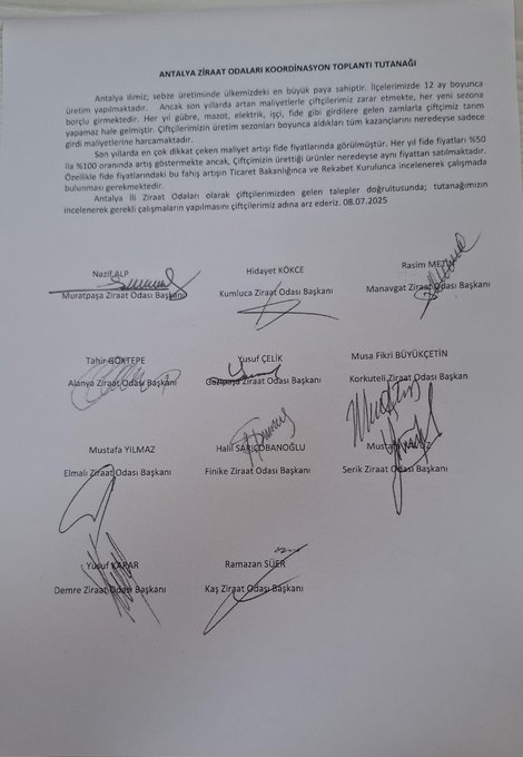Hazırlanan tutanağın altında Antalya’nın 11 farklı ilçesindeki ziraat odası başkanının imzası bulunuyor. Muratpaşa’dan Kaş’a kadar uzanan bu birliktelik, üreticinin ortak sorununa dikkat çekiyor:
