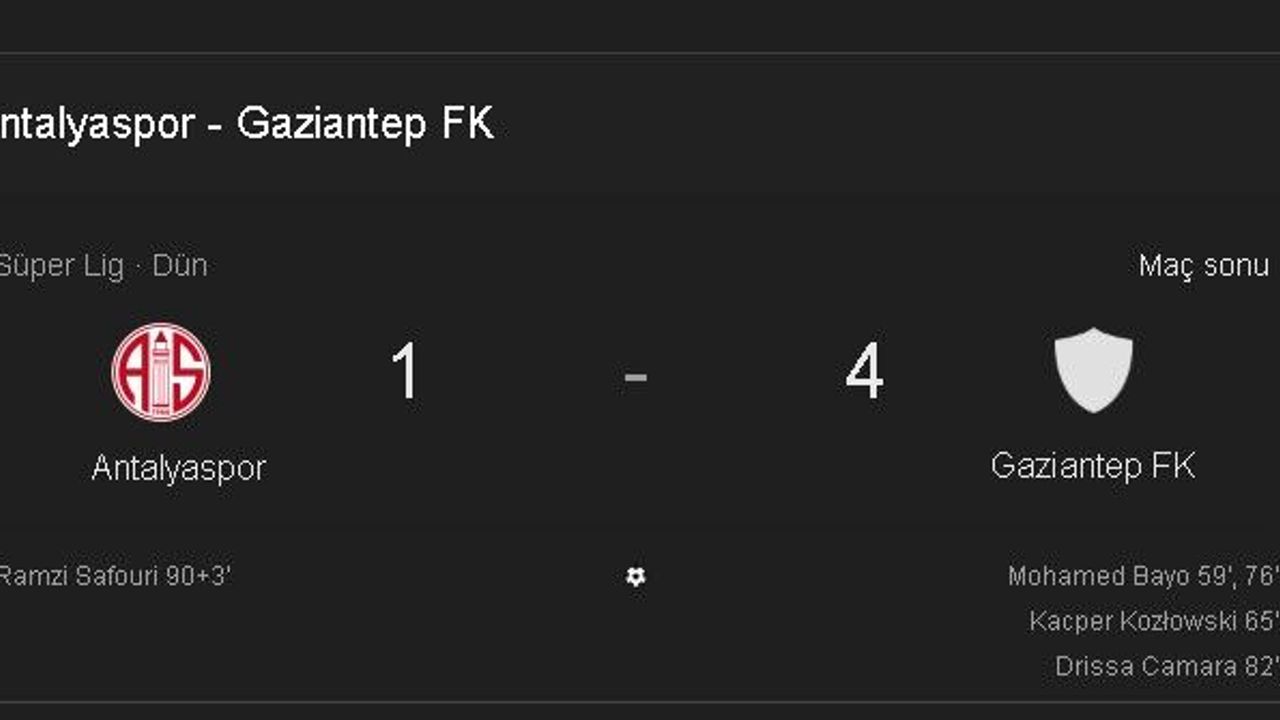 Karşılaşmanın kalan bölümünde başka gol olmayınca mücadele Gaziantep FK’nın 3-2’lik üstünlüğüyle sona erdi. Bu sonuçla Gaziantep temsilcisi önemli bir deplasman galibiyeti elde ederken Antalyaspor ise sahasında puan kaybı yaşadı.