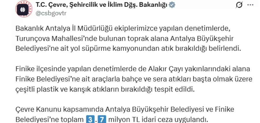 Çevre, Şehircilik ve İklim Değişikliği Bakanlığı, Antalya İl Müdürlüğü ekiplerinin yaptığı denetimler sonucunda Antalya Büyükşehir Belediyesi ve Finike Belediyesi’ne çevre kirliliği nedeniyle toplam 3 milyon 700 bin TL idari ceza uygulandığını açıkladı.