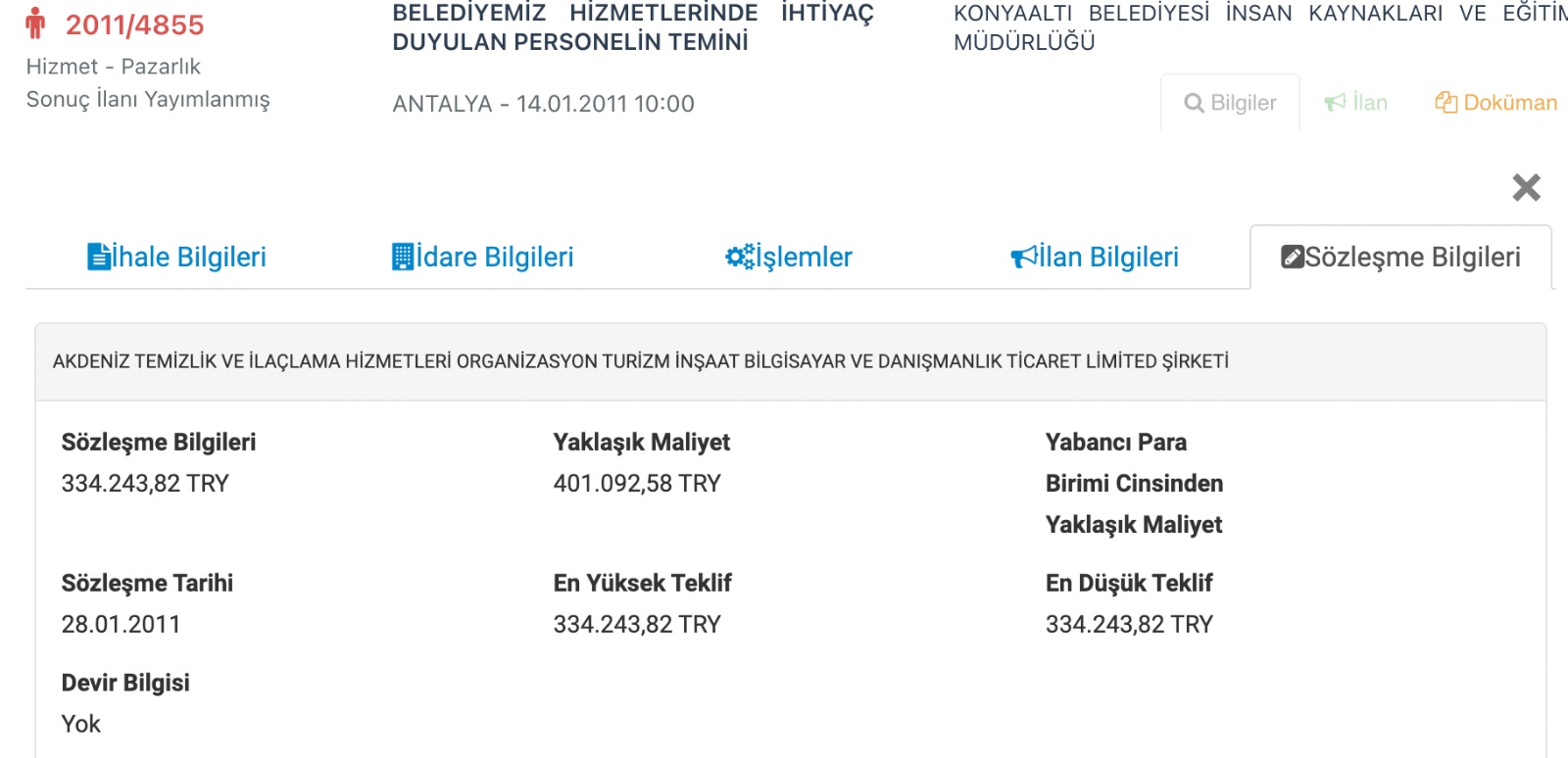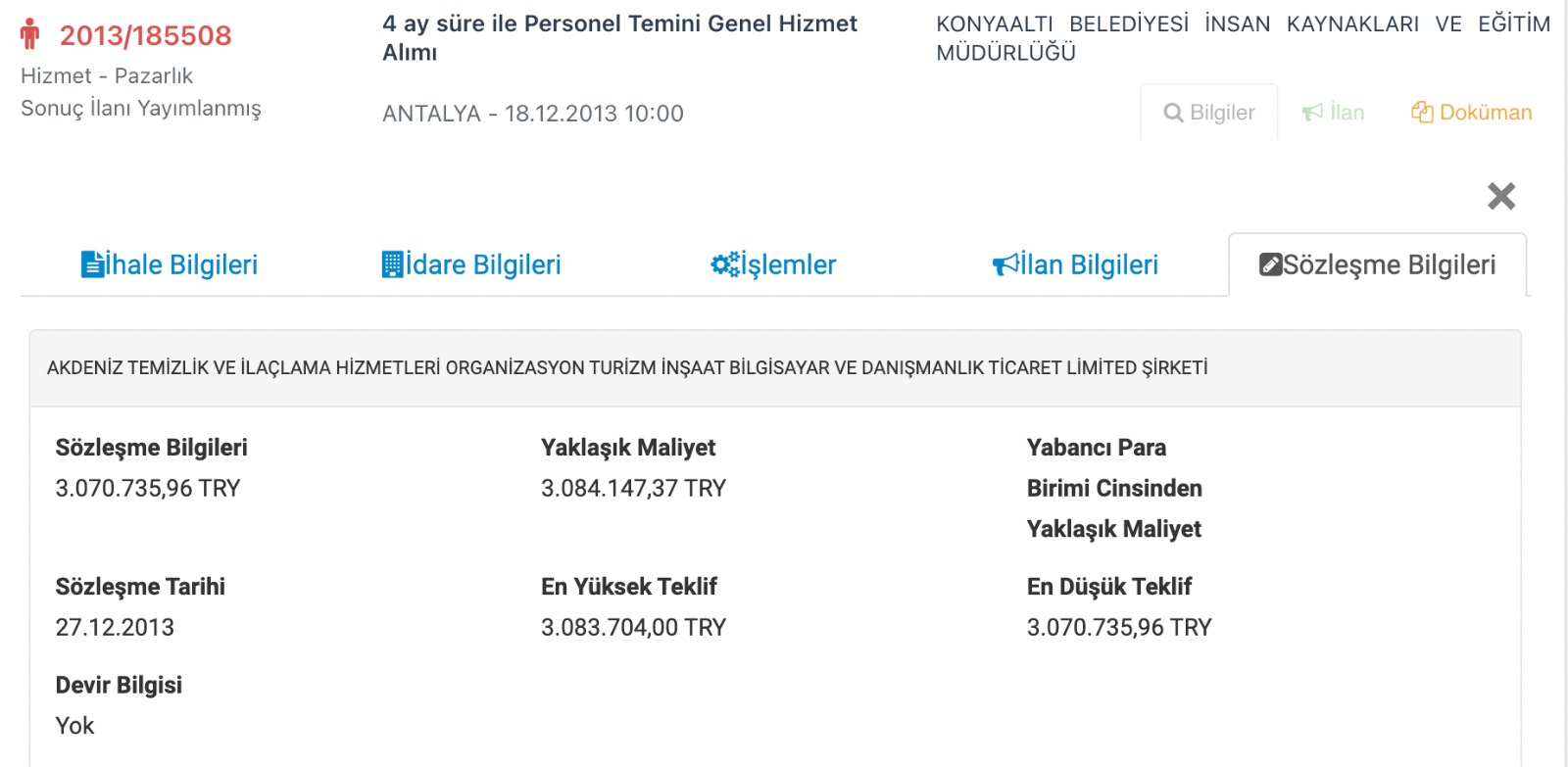 Nisan 2013’de Konyaaltı Belediyesi’nin taşeron personel ihalesi el değiştiriyor ve bugün itirafçı olan bir başka iş insanı Aziz İhsan Aktaş’a ait Bilginay Temizlik LTD’ye veriliyor. 2013 yılında Konyaaltı Belediyesi aynı başlık altında personel teminiyle ilgili 4 ihale yapıyor. Diğer 3 ihale de yine Akdeniz Temizlik şirketine veriliyor. Yusuf Yadoğlu ile Aziz İhsan Aktaş’ın adları belediyelere yapılan son operasyonlarda birlikte anılmıştı. Konyaaltı Belediyesi’nin ihaleleri yıl içinde her iki şirket arasında paylaşılmış.