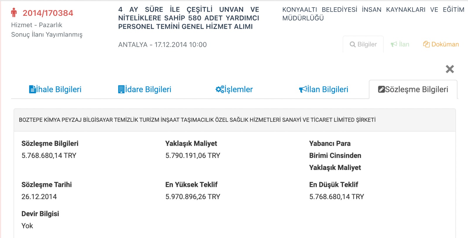 Akdeniz Temizlik şirketi, 2012 yılında “Boztepe Kimya Peyz. LTD” adında Döşemealtı merkezli bir şirket daha kuruyor. Bu şirket de 2014 yılında Konyaaltı Belediyesinden personel temini konusunda iki ayrı ihale alıyor.