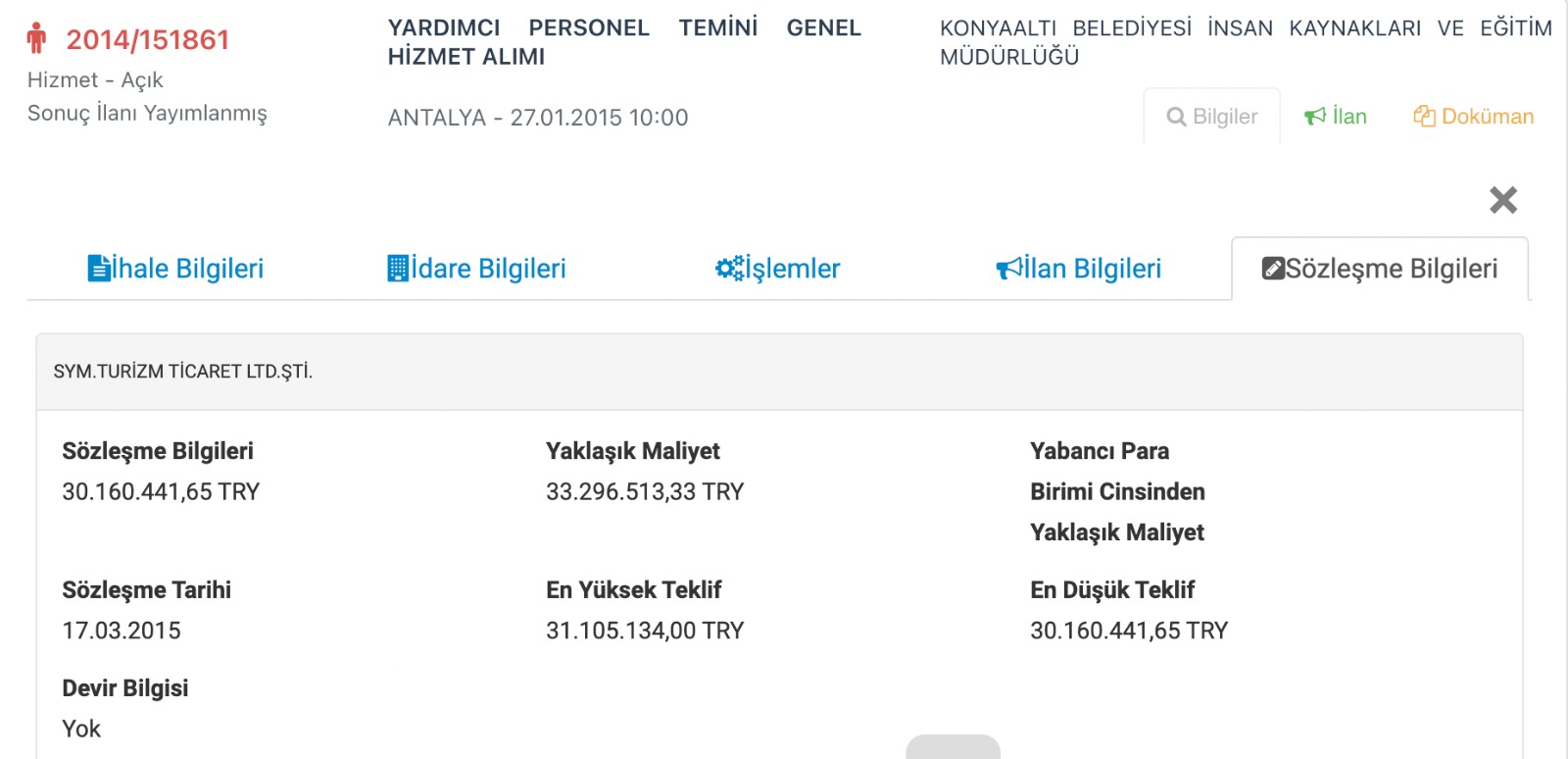Yusuf Yadoğlu’nun bir başka şirketi olan SYM Turizm LTD de 2015 yılında Konyaaltı Belediyesi’nden 30 milyon TL’lik bir ihale alıyor. 2015 yılındaki büyük bütçeli bu ihalenin tutarı, neredeyse önceki 4 yılın aynı başlıktaki ihalelerinin toplam tutarından daha fazla bir meblağ. O dönemin kuruna göre yaklaşık 11,5 milyon Dolar ediyor. 2011’de aynı başlıktaki 3 ihale için 4,9 milyon, 2013’de 4 ihale için 11,5, 2014’de iki ihale için toplam 11 milyon TL ödendiği düşünüldüğünde bir yılda ödenen paranın büyüklüğü daha iyi anlaşılıyor.