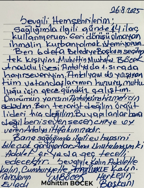 Antalya Büyükşehir Belediye Başkanı Muhittin Böcek, 5 Temmuz’dan bu yana tutuklu bulunduğu Döşemealtı L Tipi Cezaevi’nden bir mektup gönderdi. Sağlık sorunlarına dikkat çeken Böcek, “Günde 14 ilaç kullanıyorum, geri dönüşü olmayan ihmalin kurbanı olmak istemiyorum” dedi. Ev hapsi talebinin dahi kabul edilmediğini belirten Böcek, adaletin er ya da geç yerini bulacağına inandığını vurguladı.