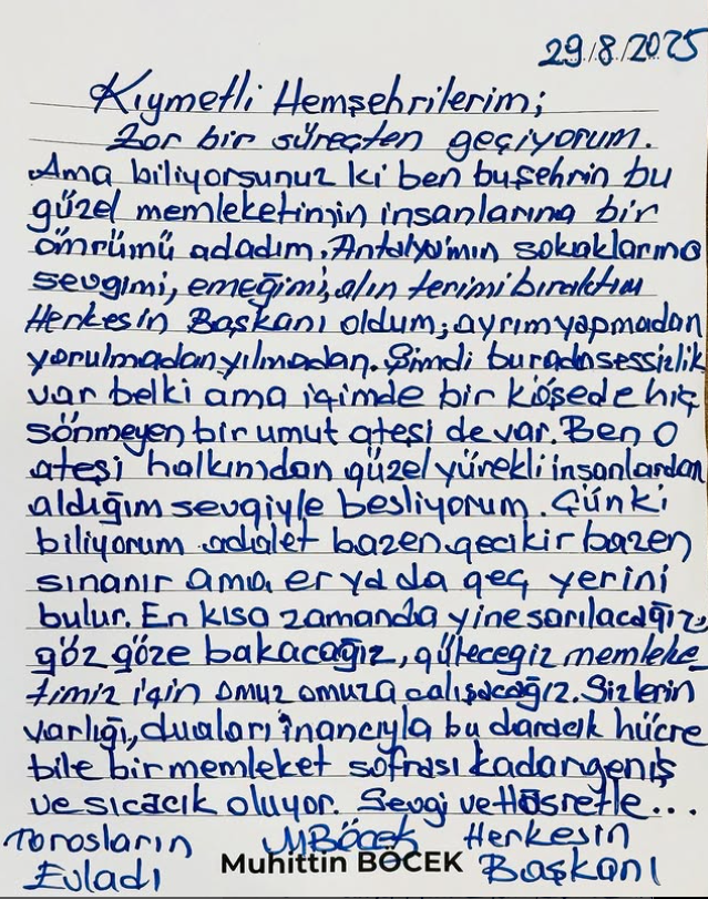 5 Temmuz’dan itibaren rüşvet ve intikap suçlamasıyla tutuklu bulunan Antalya Büyükşehir Belediye Başkanı Muhttin Böcek, Döşemealtı L Tipi Cezaevi’nden Antalyalılara gönderdiği notta umut mesajı verdi.