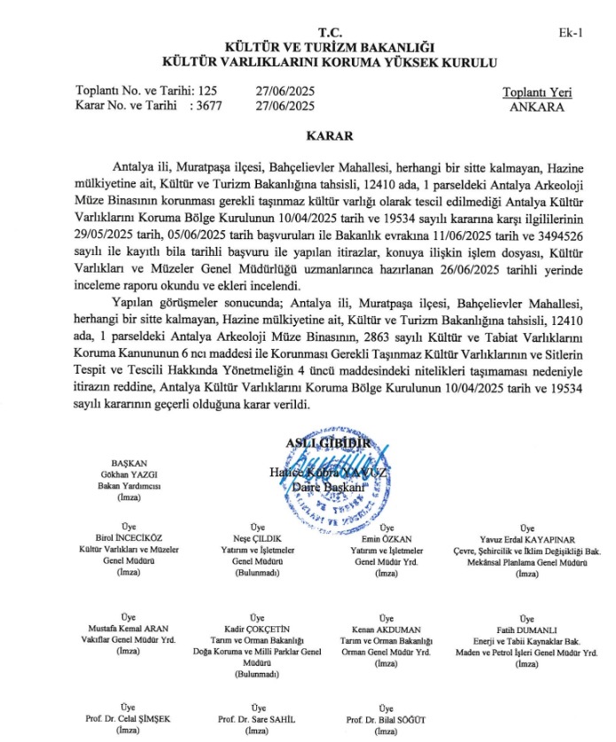 İtiraz başvuruları aynı konuyu içerdiği için birlikte değerlendiren Kültür Varlıklarını Koruma Yüksek Kurulu, 27 Haziran 2025 tarihli kararında, Bölge Kurulu’nun ret kararını onayladı. Yüksek Kurul, Antalya Arkeoloji Müzesi binasının 2863 sayılı kanun kapsamındaki yönetmelikle belirlenen nitelikleri taşımadığına karar verdi...
