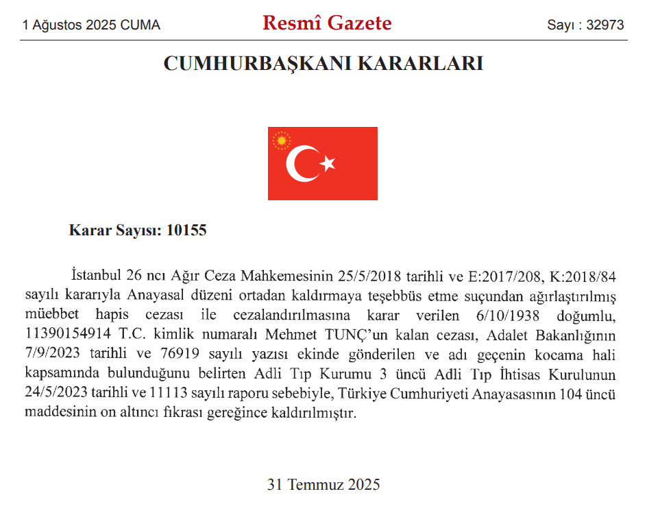 Benzer şekilde, 15 Temmuz 2016’da İstanbul Büyükşehir Belediyesi’nde Sivil Savunma Sekreteri olarak görev yapan Mehmet Tunç’un “anayasal düzeni ortadan kaldırmaya teşebbüs” suçundan aldığı ağırlaştırılmış müebbet cezası da Adli Tıp Kurumu raporuna dayanılarak affedildi.