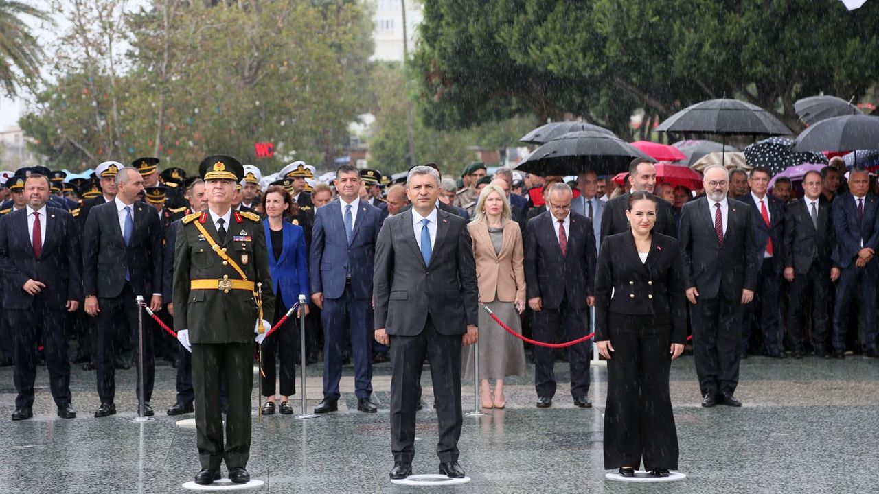 Öğrencilerin Türk bayraklarıyla süslediği meydanda, askeri bando eşliğinde çeşitli marşlar seslendirildi. Vali Şahin, Garnizon Komutanı Eren ve Büyükşehir Başkan Vekili Özdemir'in Atatürk Anıtı'na çelenk sunumunun ardından da saygı duruşunda bulunuldu ve İstiklal Marşı okundu. Tören sırasında yoğun sağanak görülürken, hem protokol hem de vatandaşlar yağıştan etkilendi. Tören boyunca yoğun yağışa rağmen ön taraftaki protokol üyeleri şemsiye kullanmazken, arkada bulunanlardan bazıları ise şemsiyeyle korunmaya çalıştı. Siyasi partiler ve sivil toplum örgütleri de anıta çelenk sunumu gerçekleştirdi.