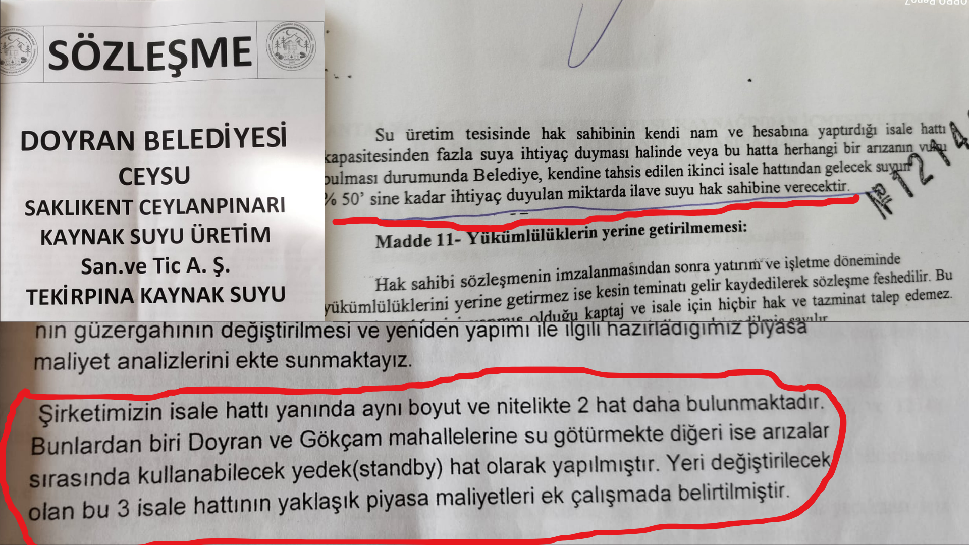 Kıvrak, “Sözleşmedeki bir hattımızdaki hakkımız ve yedek hattan yüzde elli hakkımızdan alacağımız su bize yeter. Bizim hakkımız saniyede 5 litre yedek borudan da yüzde 50 hakkımız var; yani saniyede 7,5 litre imkânından söz ediyoruz. Köyümüzde ayrıca Kızılcıklı ve Çaltılı adlı iki kaynak suyumuz var; onlar da aktif kullanılabilir ama henüz devreye alınmadı. Tüm bunlara rağmen bugün Doyran Mahallesi’nde köylüye ayrılan depoda bir eve yetecek su yok. Nereden biliyoruz, depomuz yeni yapıldı ama hala sondaj suyu içiyoruz. Sondajı kapatalım, depodaki suyu devreye sokalım, elektrik maliyeti de olmaz” diyor