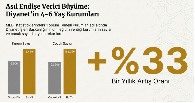 Raporda “Toplum Temelli Kurumlar” başlığı altında yer alan ve büyük bölümü Diyanet İşleri Başkanlığı’na bağlı 4–6 yaş grubu dini eğitim veren kurumlara dikkat çekildi. Bu kurumların sayısının 6 bin 459’a, bu kurumlarda eğitim alan çocuk sayısının ise 163 bin 26’ya yükseldiği belirtildi.