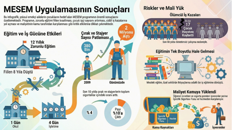 Mesleki Eğitim Merkezleri (MESEM) uygulaması ise çocuk işçiliğini meşrulaştıran bir sistem olarak ele alındı. Raporda, yoksul ailelerin çocuklarının eğitimden koparılarak ucuz iş gücü haline getirildiği vurgulandı.