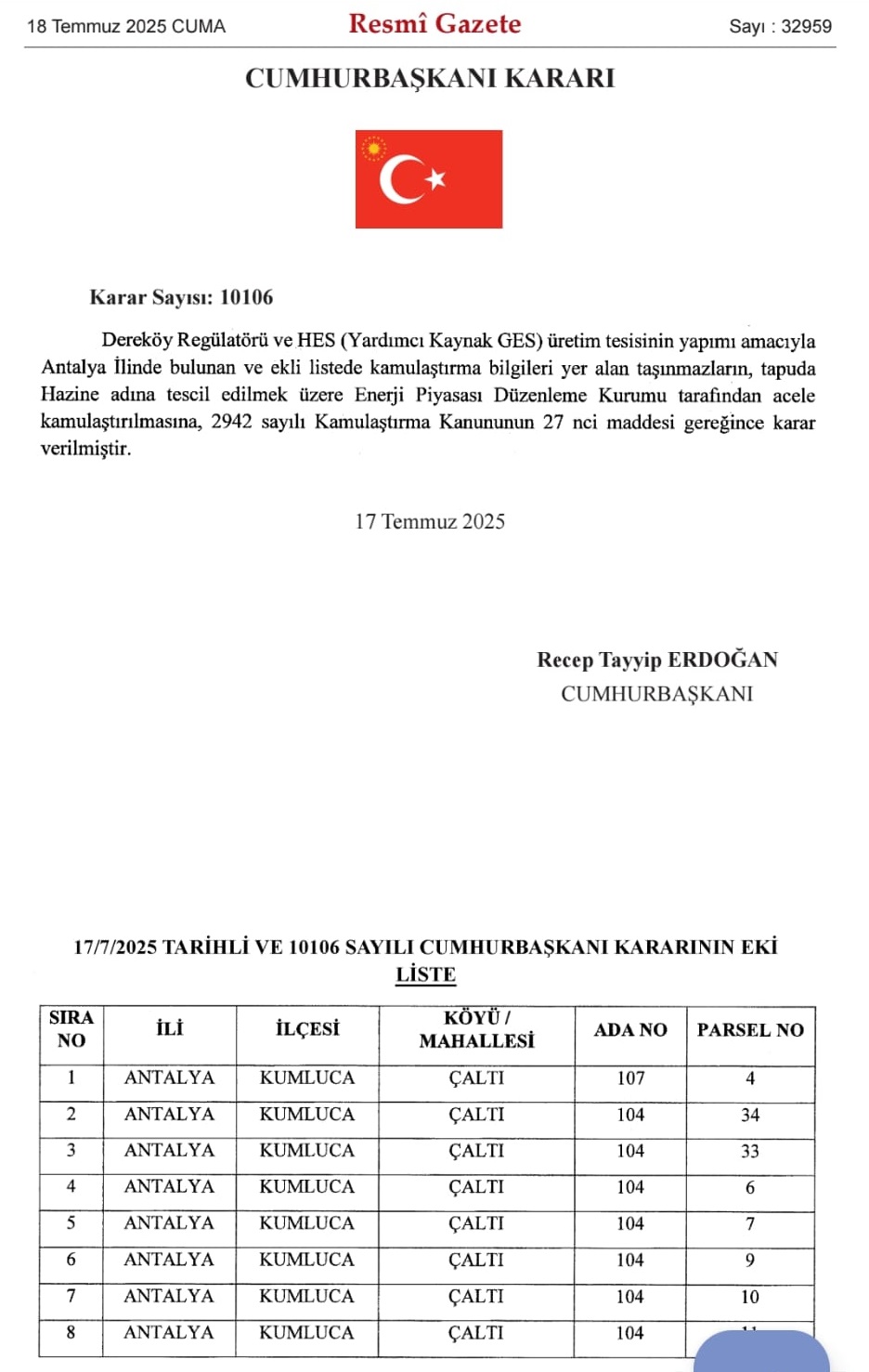 Antalya’nın Kumluca ilçesine bağlı Çaltı Mahallesinde GES projesi için acele kamulaştırma yoluyla arazilerine el konulan köylüler konuyu yargıya taşıdı. Alakır Nehri üzerinde inşa edilen Dereköy HES’te enerji üretecek yeterlilikte su bulunmayınca, bu tesise engtegre olarak üretim yapacak yardımcı GES projesi yapılması gündeme geldi. Bunun için Ekim 2021’de ÇED Gerekli Değildir kararı verilirken, 17 Temmuz 2025 tarihinde ise Cumhurbaşkanlığı kararı ile toplam 9 parselden oluşan 40 bin m2’den fazla arazi için acele kamulaştırma kararı alındı. Köylüler ise arazilerine el konulması anlamına gelen Cumhurbaşkanlığı kararının iptali için Danıştay’da dava açtı.