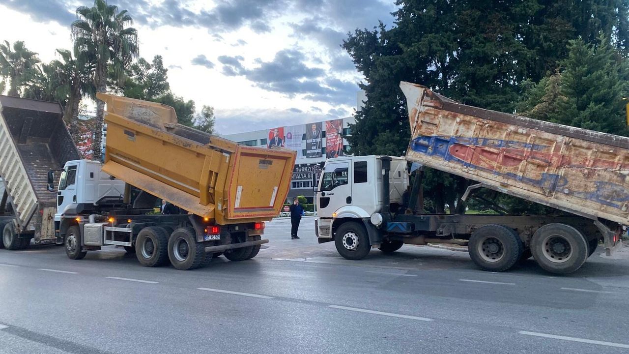 Antalya Briketçiler, Nalburiyeciler, İnşaat Malzemecileri ve Hafriyatçılar Esnaf Odası Başkanı Mustafa Gün ve çok sayıda hafriyatçı esnafı, Antalya Büyükşehir Belediyesi tarafından uygulanan cezaları haksız bulduklarını belirterek belediye önünde dün gece saatlerinde toplandı. Sabah erken saatlerde de kamyonlarıyla belediye önüne gelerek seslerini duyurmaya çalışan hafriyatçılar, araçları da belediye önündeki yola park etti.