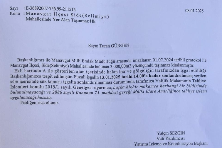 Antalya Valiliği, 8 Ocak 2025 tarihinde Manavgat Selimiye Mahallesi’ndeki Sunrise Queen Resort Hotel yönetimine, Manavgat İlçesi Side (Selimiye) Mahallesi'nde bulunan 3.000 metrekarelik taşınmazı işgal ettikleri, Manavgat Milli Emlak Müdürlüğü ile yapılan bir protokolle alanın 1 Temmuz 2024 tarihinde özel bir şirkete kiralandığı ve alanı tahliye etmesi yönünde bir yazı gönderdi. Bu yazının ardından Manavgat Kaymakamlığı da 9 Ocak 2025 tarihinde İlçe Jandarma Komutanlığı'na talimat vererek Valiliğin kararının otel yönetimine elden tebliği ve tahliyesini istedi.