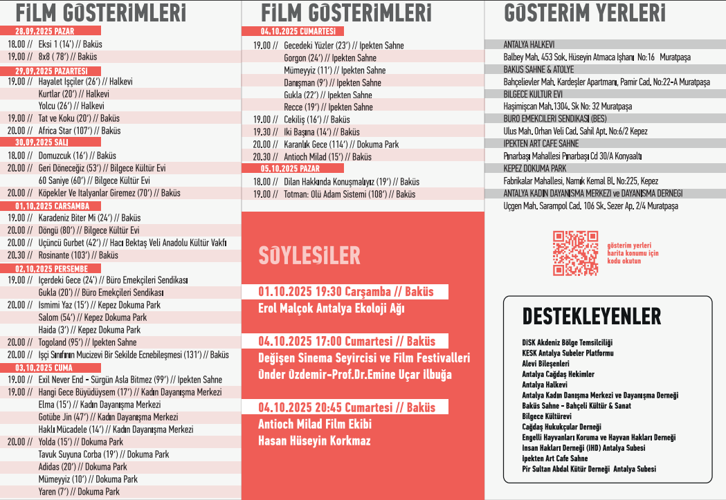 Antalya gösterimleri, 27 Eylül Cumartesi saat 20.00’de Konyaaltı’ndaki Nazım Hikmet Kongre Merkezi Tarık Akan Salonu’nda yapılacak açılış gecesiyle başlayacak. Kentteki hak mücadelesi ve direnişlerin temsilcilerine dayanışma plaketleri verilecek.
