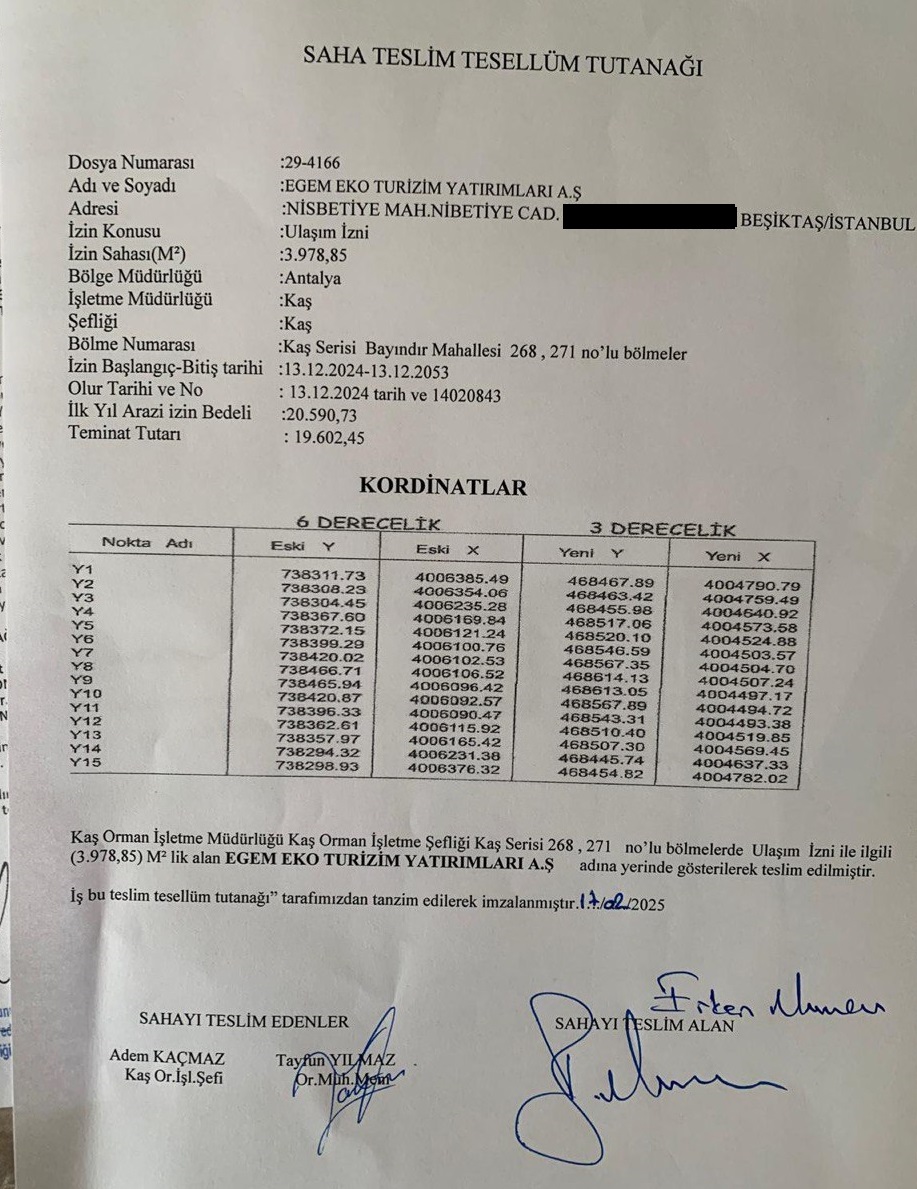 Antalya Orman Bölge Müdürlüğü’nün 3 bin 978 metrekarelik orman arazisinden yol açılması için izin verdiği İstanbul merkezli Egem Eko Turizm Yatırımları Anonim Şirketi’nin, eski Kültür ve Turizm Bakanı Erkan Mumcu’ya ait olduğu ortaya çıktı.