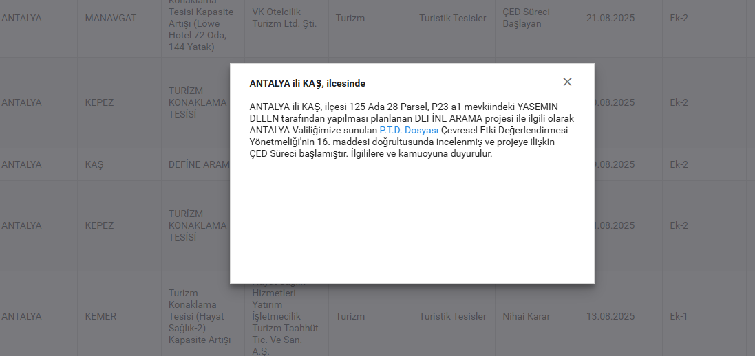 Yönetmelik değişikliğinin yürürlüğe girmesinin ardından ülke genelinde define aramak için yapılan ÇED başvurularında 181 işlem yapıldığı görülüyor. Bu ÇED başvurularından biri de Antalya’dan yapıldı. Kaş ilçesine bağlı Sütleğen Mahallesi’nde boş duran bir ev ve bahçesinde define olduğunu düşünen Antalyalı bir girişimci, Ekim 2024’de bu araziyi iki yıllığına varislerden kiraladı. Ardından define aramak için bir proje dosyası hazırlayan Y.D. adındaki girişimci, 575 bin TL bedelli projesini Antalya Valiliği (Çevre, Şehircilik ve İklim Değişikliği İl Müdürlüğü)’ne sundu.