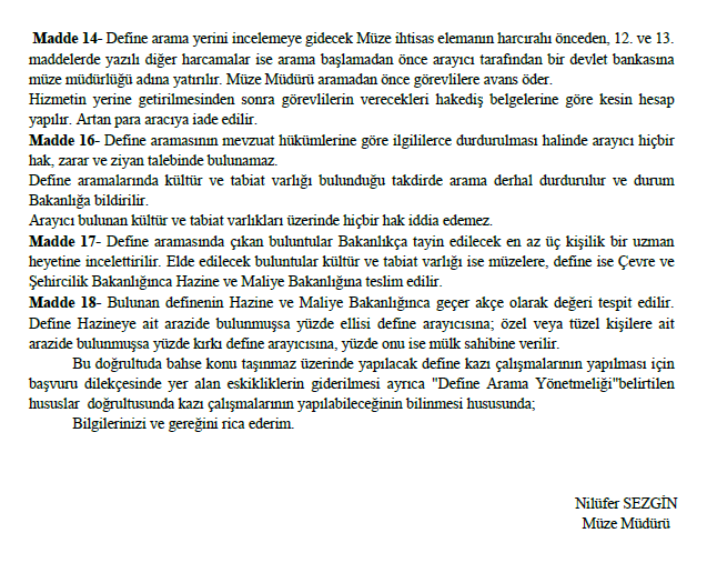 ‘Yasal’ olarak define aranması için 1984 yılında bir yönetmelik çıkartıldı. 2863 sayılı kanun kapsamında çıkartılan ‘Define Arama Yönetmeliği’, müze ve kolluk denetiminde izinli define aranmasını düzenliyor. Ancak son yıllardaki uygulamalar bu kadar da olmaz dedirmeye başladı. Türkiye’de defineci tahribatının kamuoyunun gündeminde yoğun olarak tartışıldığı en önemli olaylardan biri, Kasım 2019’da Gümüşhane’deki Dipsiz Göl’ün define aramak için kurutulmasıydı. Bu olay kamuoyunda büyük tepki çekince, 28 Kasım 2019’da ÇED Yönetmeliği’nde yapılan değişiklikle define arama girişimleri ÇED kapsamına alındı. Buna göre define aramak isteyen kişiler, bir proje tanıtım dosyası hazırlayarak Çevre Şehircilik ve İklim Değişikliği İl Müdürlüklerine başvuracak, ilgili kurumlardan görüşler alındıktan sonra ÇED kararı olumlu çıkarsa projeye başlanacak.