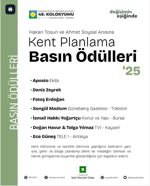 Bu ‘press’ ortamında kent bilinci üzerine kafa yoran bir meslek odası Şehir Planlamacıları Odası'na yerel basını bu ödülle kıymetlendirdikleri için teşekkür ederiz.