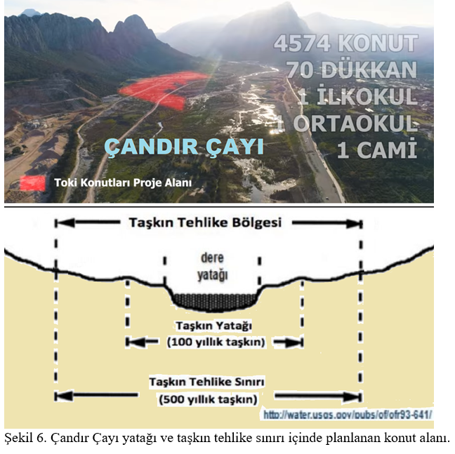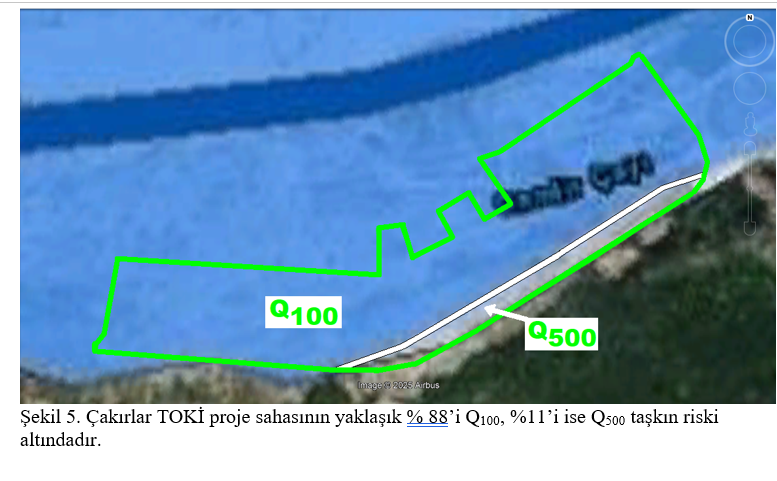 Proje alanının büyük bölümünün Çandır Çayı’nın taşkın yatağı içerisinde kaldığına dikkat çekilen raporda, IRAP (2021) verilerine göre alanın yaklaşık yüzde 88’inin 100 yılda bir gerçekleşmesi muhtemel taşkın (Q100), yüzde 11’inin ise 500 yıllık taşkın (Q500) riski altında olduğu ifade edildi.