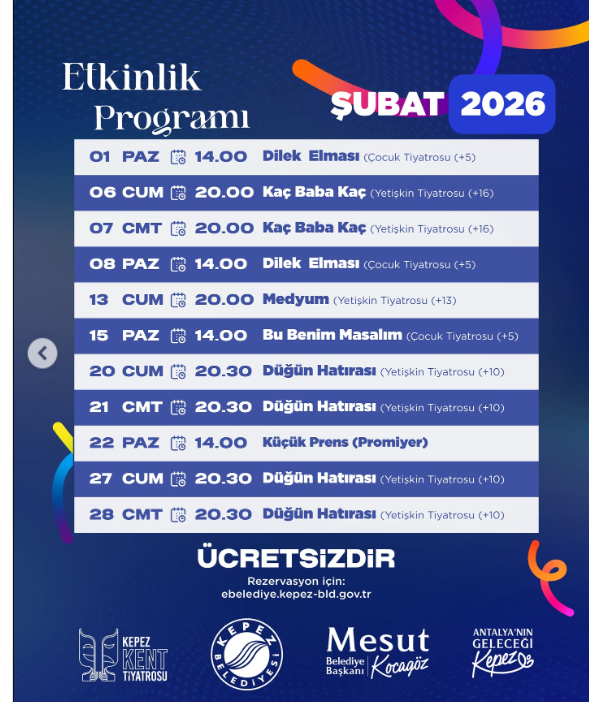 Kepez Belediyesi bünyesinde faaliyet gösteren Kepez Kent Tiyatrosu, Şubat 2026 etkinlik programını açıkladı. Ay boyunca sahnelenecek oyunlar, hem çocuklara hem de yetişkinlere hitap eden zengin bir repertuvar sunarken, tüm etkinliklerin ücretsiz olması dikkat çekti.