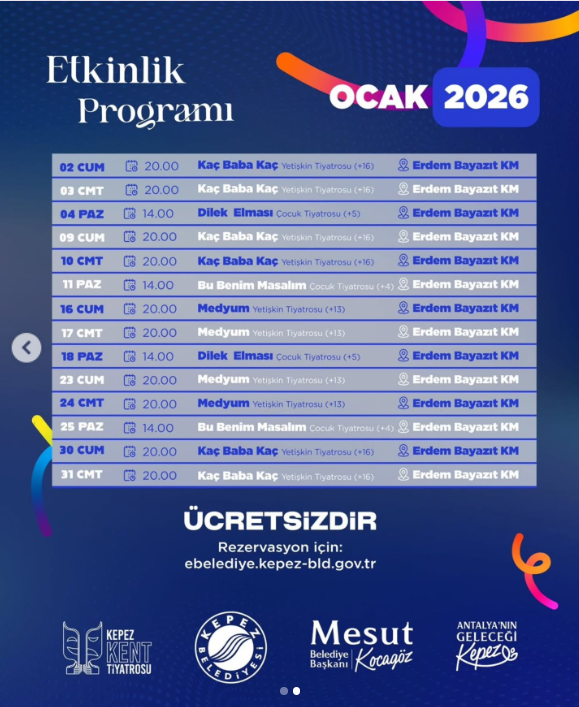 Kepez Belediyesi Kent Tiyatrosu, 2026 yılının ocak ayında yetişkin ve çocuklara yönelik birbirinden farklı oyunları tiyatroseverlerle buluşturuyor. Erdem Bayazıt Kültür Merkezi’nde sahnelenecek oyunların tamamı ücretsiz olacak ve rezervasyonlar belediyenin internet sitesi üzerinden yapılabilecek.