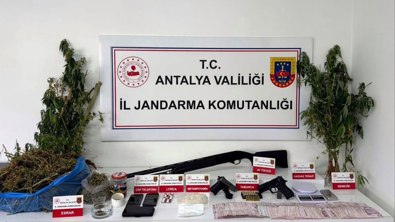 Operasyon, Antalya ve Alanya Cumhuriyet Başsavcılıklarının talimatları doğrultusunda, İl Jandarma Komutanlığı İstihbarat ve Narkotik Şube Müdürlükleri ile Kepez ve Alanya İlçe Jandarma Komutanlıkları tarafından gerçekleştirildi. Uyuşturucu ile mücadele kapsamında 4 şüpheliye ait adreste arama yapıldı. Ekipler, 3 bin kullanımlık cannaboid uyuşturucu madde, 316 gram metamfetamin, 1 kilo 768 gram kubar esrar, 21 sentetik ecza, 3 hassas terazi, 38 kök kenevir, av tüfeği, 2 tabanca, 2 şarjör ve 53 tabanca fişeği, 3 cep telefonu ile 71 bin lira suçtan elde edilen para ele geçirdi. 4 şüpheli hakkında adli tahkikat başlatıldı.
