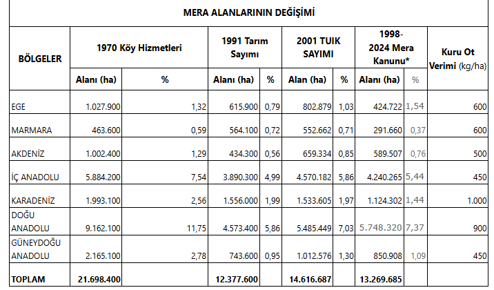 Türkiye’nin mera alanlarının büyüklüğü 1940’lı yıllarda 44 milyon hektarla ülke coğrafyasının yarısına yakınken günümüzde bu oran yüzde 14,6 seviyesine düştü. Bir başka deyişle her üç mera alanından ikisini kaybettik. Tarım ve Bakanlığı verilerine göre 1970’de 21,6 milyon hektar olan mera alanları, 2024’de 13,2 milyon hektara geriledi. Doğu Anadolu’dan İç Anadolu’ya, Akdeniz’den Ege’ye birçok bölgedeki mera alanlarının son 50 yılda yarı yarıya azaldığı görülüyor.