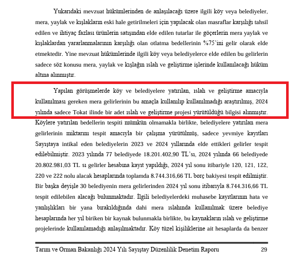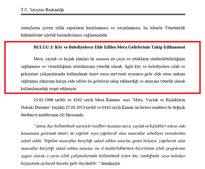 Sayıştay’ın Eylül 2025 tarihli raporunda, “Mera, yaylak ve kışlak alanları ile umuma ait çayır ve otlakların sürdürülebilirliğinin sağlanması ve verimliliğinin artırılmasına yönelik olarak, ilgili köy ve belediyelere ıslah ve geliştirme çalışmalarında kullanılmak üzere mera mevzuatı uyarınca gelir elde etme imkânı sağlanmış olmasına karşın elde edilen bu gelirlerin takip edilmediği ve amacına yönelik olarak kullanılamadığı tespit edilmiştir” tespitine yer verildi.