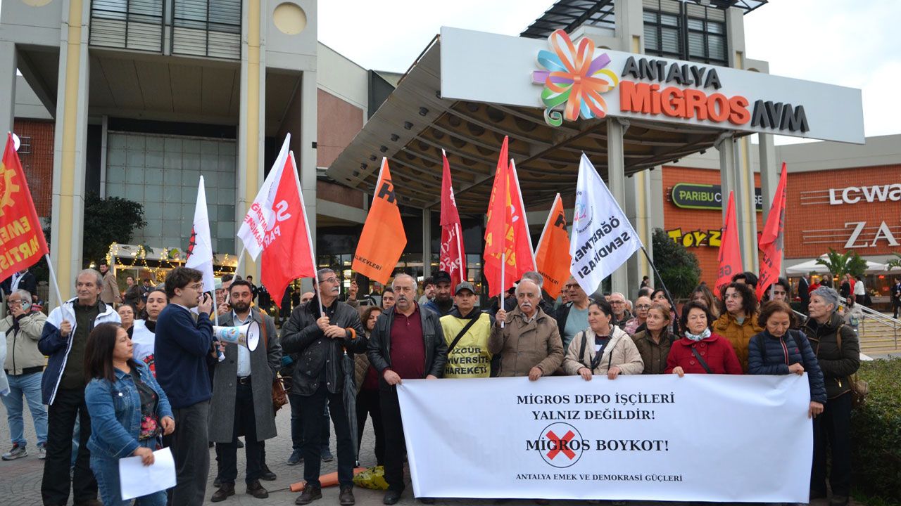 Antalya Emek ve Demokrasi Güçleri, insanca yaşam koşulları talebiyle eylemde olan Migros depo işçilerine destek vermek için Antalya 5M Migros AVM önünde bir araya geldi. Basın açıklamasında Migros’un bağlı olduğu Anadolu Grubu’nun sahibi Tuncay Özilhan’ın açıklamaları sert sözlerle eleştirildi.