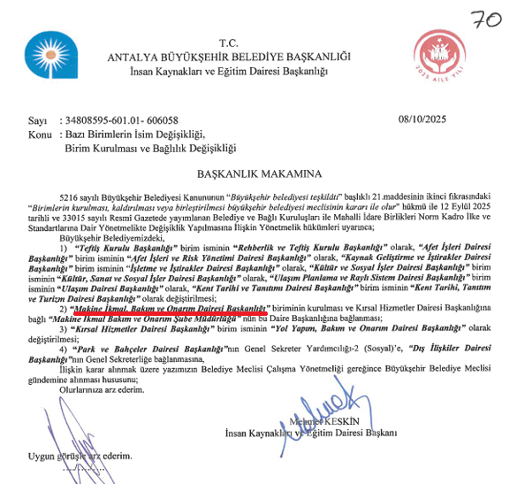 Antalya Büyükşehir Belediyesi bünyesinde Makine İkmal, Bakım ve Onarım Dairesi Başkanlığı kurulması için Belediye Meclisine teklif sunuldu. İnsan Kaynakları ve Eğitim Dairesi tarafından hazırlanan teklifte, bazı birimlerin adının değiştirilmesi ile yeni birim kurulması konusunda başlıklar yer alıyor. 13 Ekim 2025 tarihinde toplanacak olan Antalya Büyükşehir Belediye Meclisi’nin gündemine sunulan teklifte, kurum bünyesindeki makine ve araçların bakım ve onarımlarının yapılması için Makine İkmal, Bakım ve Onarım Dairesi Başkanlığı kurulması önerisi dikkat çekiyor.