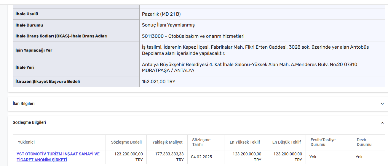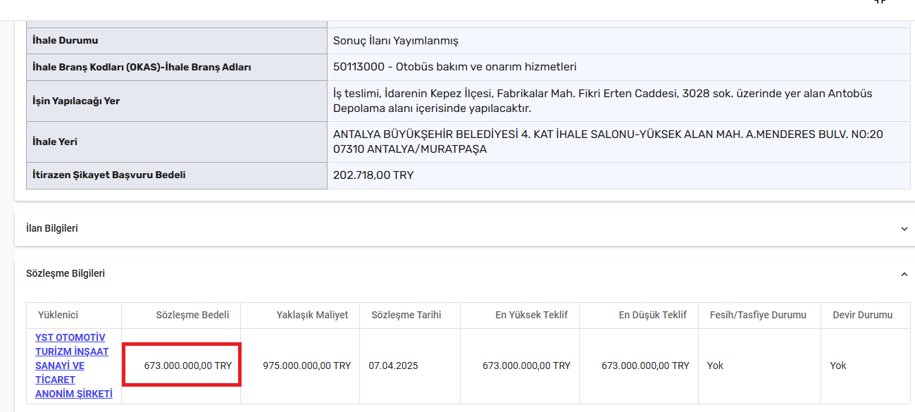 İstanbul’da yürütülen soruşturmanın Antalya Büyükşehir Belediyesi’ne sıçramasına neden olan iş insanı Yusuf Yadoğlu’na ait bir şirket olan YST Otomotiv Tur. İnş. San. AŞ’nin kurumdan 4 Şubat 2025’de 123 milyonluk otobüs bakım ve onarımı ihalesi aldığı görülüyor. Bu ihaleden iki ay sonra, 7 Nisan 2025 tarihinde yapılan bir başka ihalenin sözleşmesine göre Yadoğlu’nun şirketine ‘otobüs bakım ve onarım hizmetleri’ için Büyükşehir Belediyesi’nin 673 milyon ödediği görülüyor. Yusuf Yadoğlu’nun şirketine 2024 yılında aynı başlıkta verilen iki ayrı ihalede ödenen tutar ise 459 milyon TL. Yerel seçimlerin öncesi ve sonrasını kapsayan dönemde ‘otobüs bakım ve onarım hizmeti’ için Yadoğlu’nun şirketine 1 milyar 255 milyon 560 bin TL ödeme yapılmış.