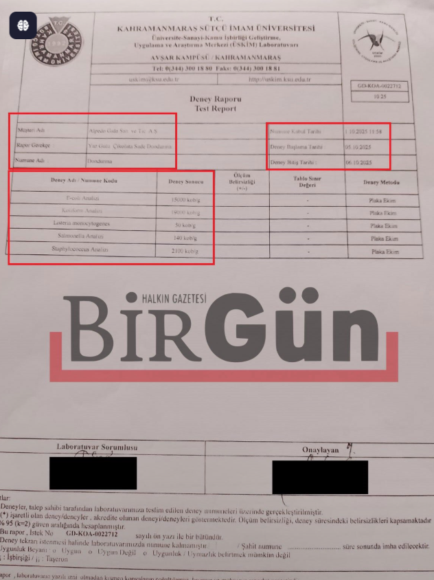 BirGün’den İsmail Arı’nın haberine göre, Kahramanmaraş Sütçü İmam Üniversitesi laboratuvarlarında 1 Ekim 2025’te yapılan incelemede; Alpedo markalı sade dondurmada salmonella, listeria monocytogenes, e.coli, koliform ve staphylococcus aureus bakterileri tespit edildi.