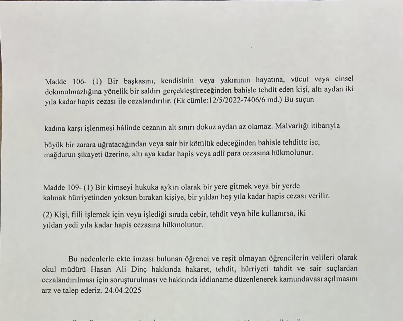 Öğrenci ve veli imzalarıyla hazırlanan dilekçede, Hasan Ali Dinç hakkında “hakaret”, “tehdit” ve “kişisel özgürlükleri kısıtlama” gibi suçlamalarla işlem yapılması talep edildi. Türk Ceza Kanunu’nun 125, 106 ve 109. maddelerine atıf yapılan dilekçede, müdürün laik ve demokratik değerlerle bağdaşmayan davranışlar sergilediği savunuldu.