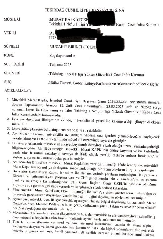 Bugün kuruluşunu kutladığımız AKP'nin MKYK üyeliği dahil, çok sayıda görev yapmış Mücahit Birinci denilen arkadaş gider, Murat Kapki ile konuşur. 31 Temmuz 2025 günü, Kapki'nin önüne 1,5 sayfalık bir ifade tutanağını koymuş. "Bunu imzalayacaksın, milyon dolarlık para vereceksin. Buradan çıkıp gideceksin" demiş.